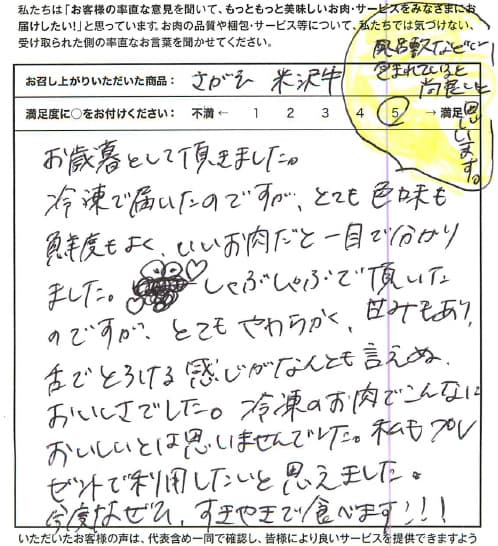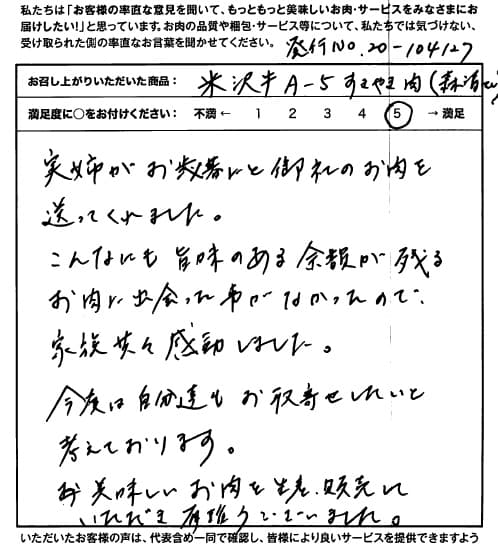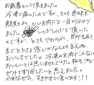お客さまの声や口コミ・レビューをご紹介いたします。お寄せいただいた温かいお言葉を励みに、もっと、もっと、ご満足いただけるお肉をご提供できるよう努めてまいります。