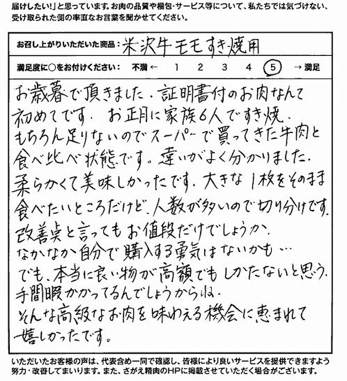 お歳暮でいただきました。証明書付のお肉なんて初めてです。お正月に家族6人ですき焼、もちろん足りないのでスーパーで買ってきた牛肉と食べ比べ状態です。違いがよく分かりました。柔らかくて美味しかったです。大きな1枚をそのまま食べたいところだけど、人数が多いので切り分けです。改善点と言ってもお値段だけでしょうか。なかなか自分で購入する勇気はないかも...でも本当に良い物が高額でもしかたないと思う。手間暇かかってるんでしょうからね。そんな高級なお肉を味わえる機会に恵まれて嬉しかったです。