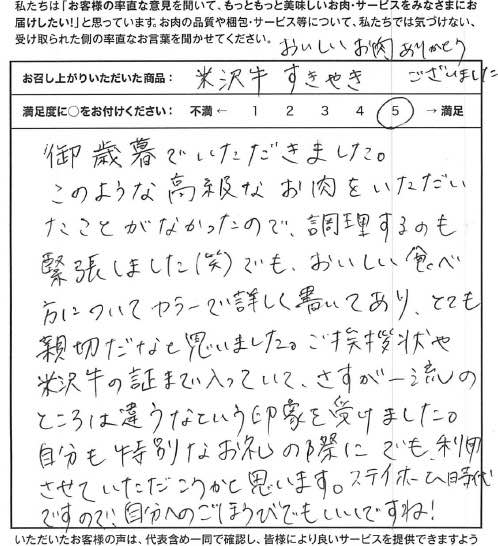 御歳暮でいただきました、このような高級なお肉をいただいたことがなかったので、調理するのも緊張しました(笑)でも、おいしい食べ方についてカラーで詳しく書いてあり、とても親切だなと思いました。ご挨拶状や米沢牛の証まで入っていて、さすが一流のところは違うなという印象を受けました。自分も特別なお祝いの際にでも、利用させていただこうかと思います。ステイホーム時代ですので、自分へのごほうびでもいいですね!