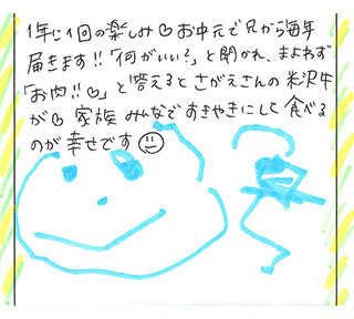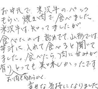 お中元で米沢牛のパックをもらい、焼き肉で食べました。米沢牛は知ってましたが、食べたのは初めてで、山形では芋汁に入れて食べると聞いてました。食べたら肉に甘味があり、お肉もやわらかく、とっても美味しかったです。幸せな気持ちになりました。