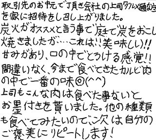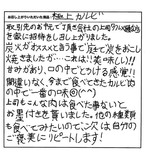 取引先のお中元で頂き会社の上司に「グルメ通な方」を家に招待をし召し上がりました。 炭火がオススメと言う事で庭で炭をおこし焼きましたが…これは!!美味しい!!甘みがあり、口の中でとろける感覚!!間違いなく、今まで食べてきたカルビ肉の中で一番の味◎(^^) 上司もこんな肉は食べた事ないとお墨付きを貰いました。他の種類も食べてみたいので、次は自分のご褒美にリピートします!