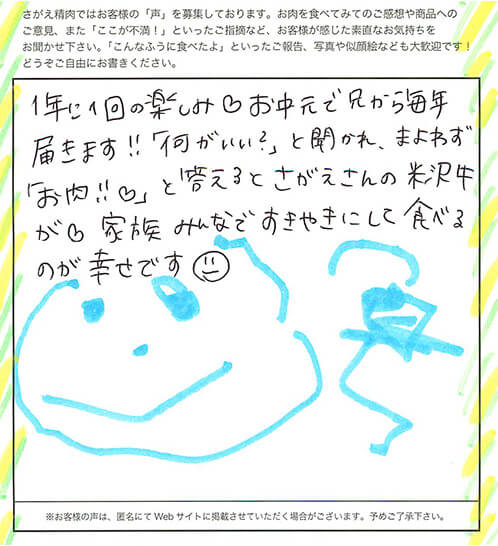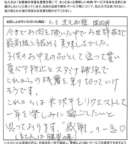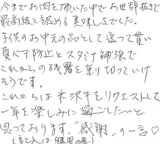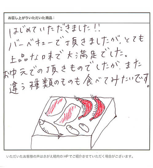 お客さまの声や口コミ・レビューをご紹介いたします。お寄せいただいた温かいお言葉を励みに、もっと、もっと、ご満足いただけるお肉をご提供できるよう努めてまいります。