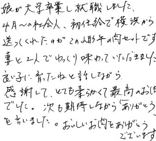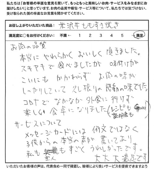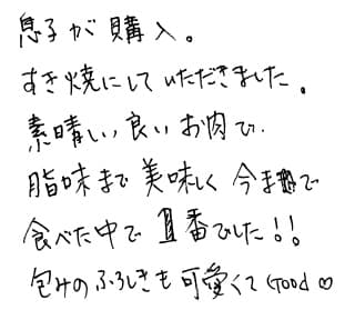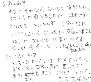 お肉の品質 本当にやわらかくおいしく頂きました。すきやきで食べましたが味付けが濃いにもかかわらずお肉の味がしっかりしていて久しぶりの感動の味でした。コロナでなかなか外食に行けず、楽しい食卓になりました。(レシピも証明書もGood)。 サービスについて メッセージカードには例文ではなく子供からの本当の声が書いてあり私も主人もすごくうれしかったです。大大大満足です。