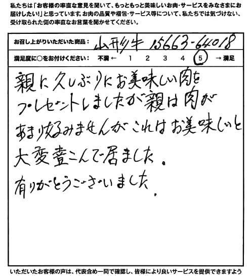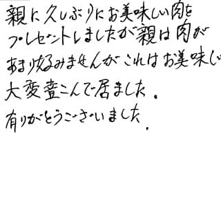 親に久しぶりに美味しいお肉をプレゼントしました。親は肉はあまり好みませんがこれは美味しいと大変喜んでいました。ありがとうございました。