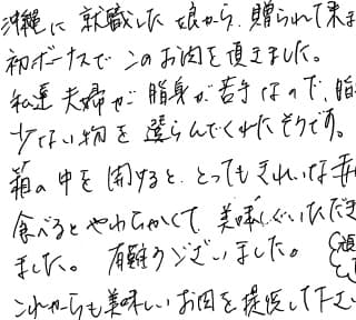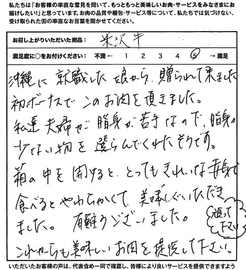沖縄に就職した娘から贈られてきました。初ボーナスでこのお肉を頂きました。私達夫婦が脂身が苦手なので、脂身の少ない物を選んでくれたそうです。箱の中を開けるととってもきれいな赤身で、食べるとやわらかくて、美味しくいただきました。有難うございました。これからも美味しいお肉を提供して下さい。