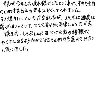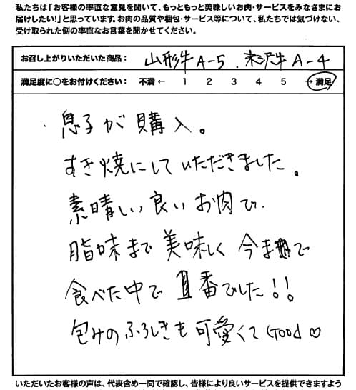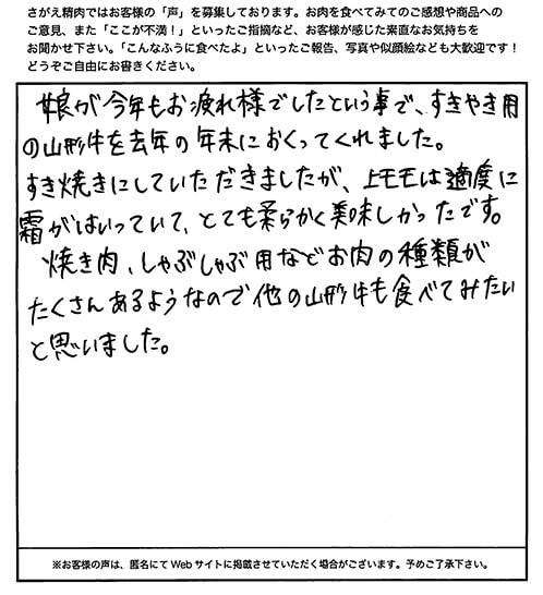 とてもおいしかったです。毎年、大晦日は家族5人ですき焼きを食べます。今年は上の子真ん中の子が社会人となり、帰省に合わせて御社のすき焼き肉を注文していてくれました。包装もきれいで開ける時嬉しかったです。一生懸命育ててきた娘から贈られたすき焼き肉。元々おいしいのでしょうが何倍にもおいしかったですよ。ごちそう様でした。子どもが働いたお金で頂けたお肉は食べたら無くなります。飲み込むのもためらいましたが、飲み込みました(笑)でもこの思い出を残したく説明文やしおりを思い出箱にしまいました。母が亡くなる時棺桶に入れてくれと頼んだら任せとけとの事でした。改善点と言われましても、何も無いのですが、これからもおいしいお肉でいろんな人を幸せにして欲しいのでこのままずっと変わらずいて欲しいです。お高いのでなかなか自分では手が出ないのですが、家族皆が集まる時に購入できたらいいなあと思います。ごちそう様でした。