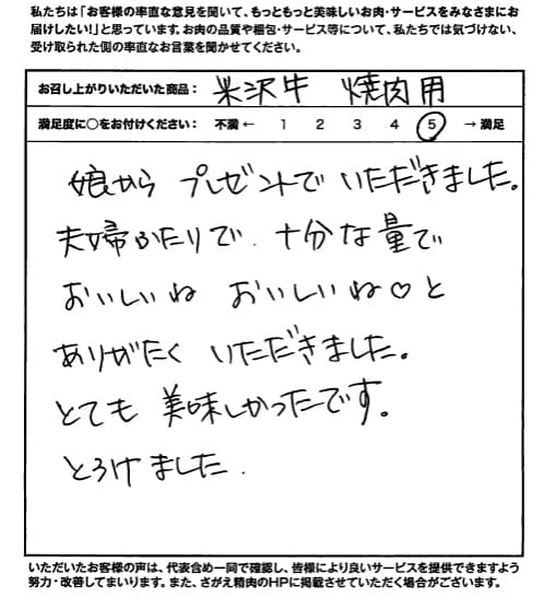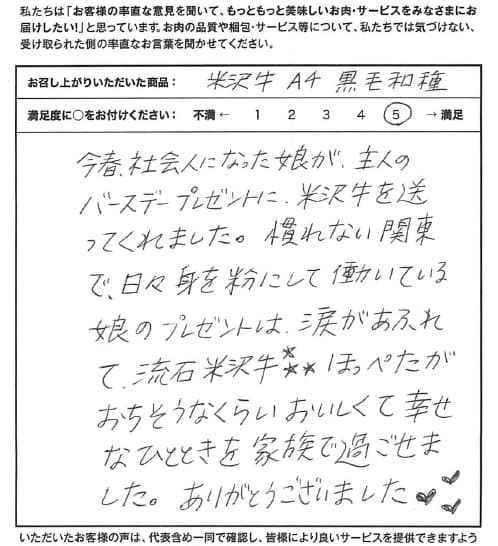 今春、社会人になった娘が、主人のバースデープレゼントに米沢牛を送ってくれました。慣れない関東で日々身を粉にして働いている娘のプレゼントは涙があふれて、流石米沢牛、ほっぺたがおちそうなくらいおいしくて幸せなひとときを家族で過ごせました。ありがとうございました♡