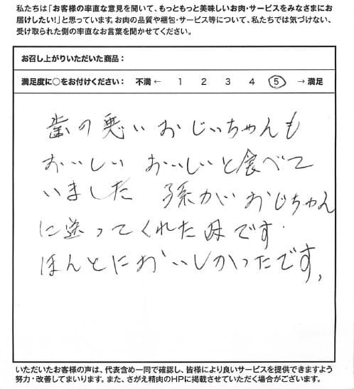 歯の悪いおじいちゃんもおいしいおいしいと食べていました 孫がおじいちゃんに送ってくれた肉です。 ほんとにおいしかったです。