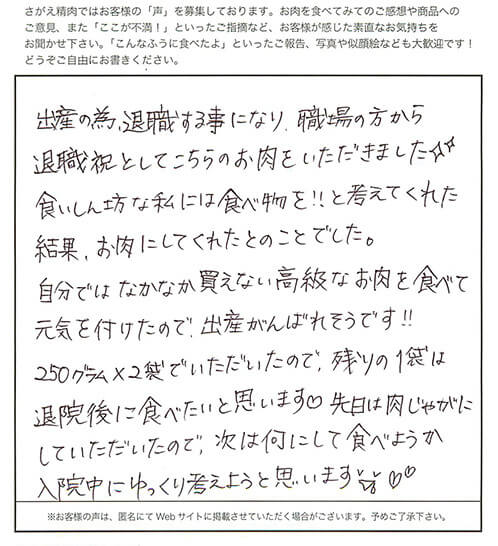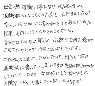 出産の為、退職する事になり、職場の方から退職祝としてこちらのお肉をいただきました!食いしん坊な私には食べ物を!!と考えてくれた結果、お肉にしてくれたとのことでした。自分ではなかなか買えない高級なお肉を食べて元気を付けたので、出産がんばれそうです!!250グラム×2袋で頂いたので、残り1袋は退院後に食べたいと思います!先日は肉じゃがにしていただいたので、次は何にして食べようか入院中にゆっくり考えようと思います!