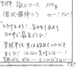 フレー!フレー!とろけるよう!旨みも十分あり、口の中で最高でした!米沢牛は実は始めていただきました!こんなに美味とは・・・・!是非ぜひ、ぜひ・・・・又いただきたい・・・です!!!
