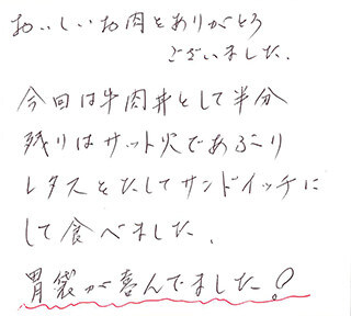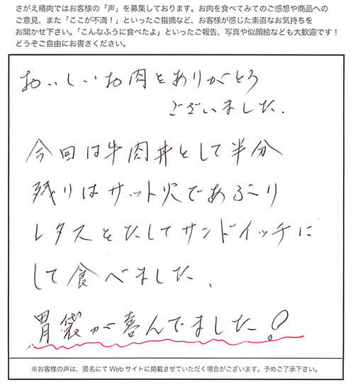 おいしいお肉をありがとうございました。今回は牛肉丼として半分残りはサット火であぶりレタスをたしてサンドイッチにして食べました。胃袋が喜んでました!