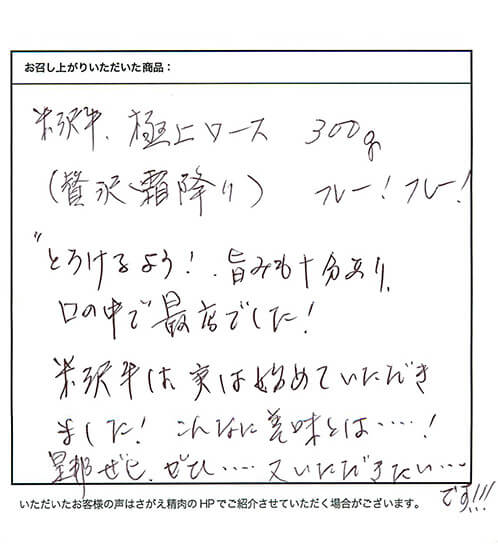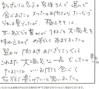 お客さまの声や口コミ・レビューをご紹介いたします。お寄せいただいた温かいお言葉を励みに、もっと、もっと、ご満足いただけるお肉をご提供できるよう努めてまいります。