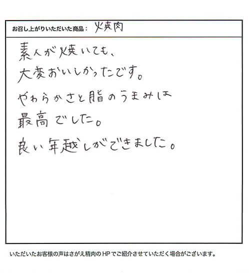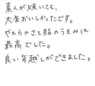 素人が焼いても、大変おいしかったです。やわらかさと脂のうまみは最高でした。良い年越しができました。