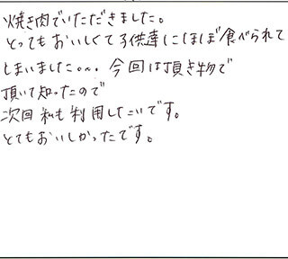 焼き肉でいただきました。とってもおいしくて子供達にほぼ食べられてしまいました。。。今回は頂き物で頂いて知ったので次回私も利用したいです。とてもおいしかったです。