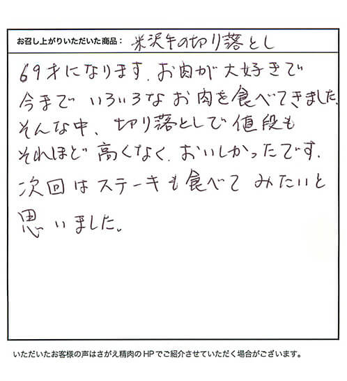 69才になります。お肉が大好きで今までいろいろなお肉を食べてきました。そんな中、切り落としで値段もそれほど高くなく、おいしかったです。次回はステーキも食べてみたいと思いました。