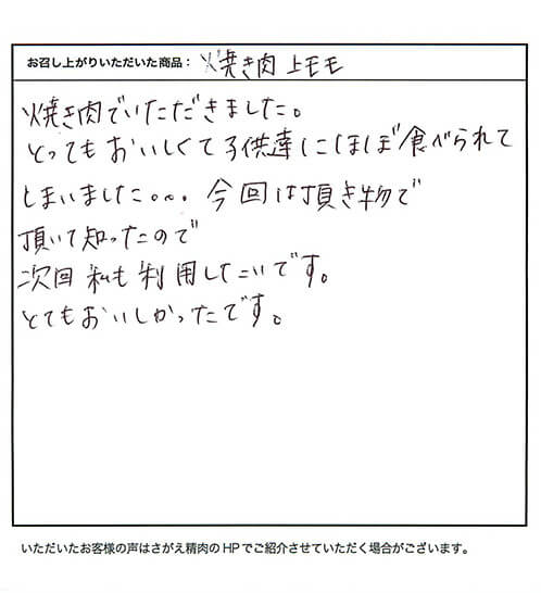 とってもおいしくて子供達にほぼ食べられてしまいました。。。【やきにく モモ/ギフト】
