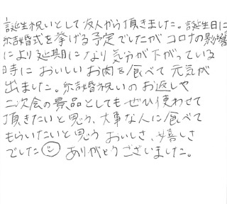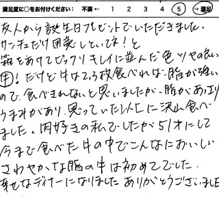 お客さまの声や口コミ・レビューをご紹介いたします。お寄せいただいた温かいお言葉を励みに、もっと、もっと、ご満足いただけるお肉をご提供できるよう努めてまいります。