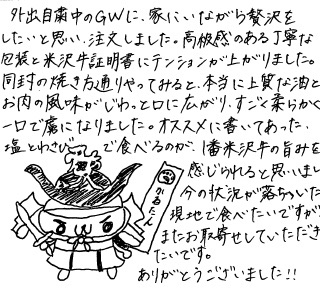 61才にて、初の米沢・山形牛でした。東京で暮らす娘からの母の日のプレゼントとして届きました。七輪にて炭火焼きし、ワサビだけで頂きました。口の中でジュワッと広がる油の甘み!!とけてしまう肉の柔らかさに感動の一言!でした。本当に美味しいお肉でした。娘にも感謝。牛さんにも感謝。さがえ精肉様にも感謝。ごちそうさまでした。ありがとうございました。