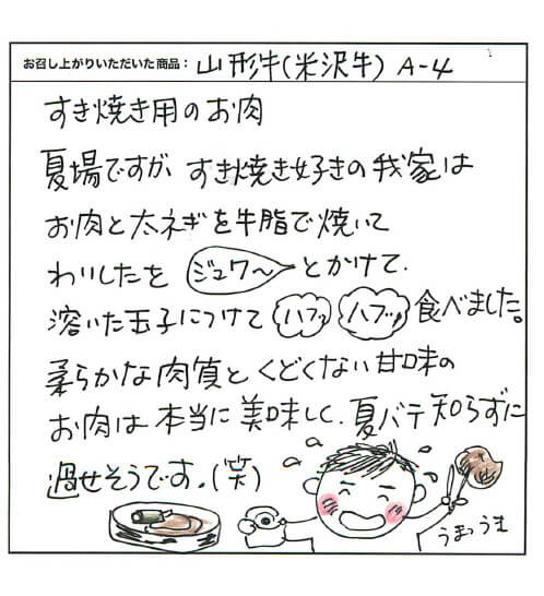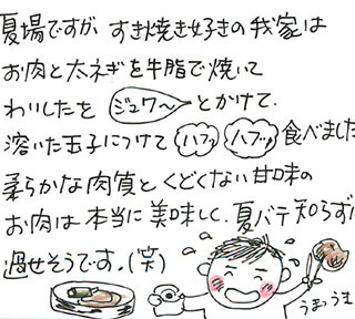 夏場ですが、すき焼き好きの我家はお肉と太ネギを牛脂で焼いてわりしたをジュワ~っとかけて、溶いた玉子につけてハフッハフッ食べました。 柔らかな肉質とくどくない甘味のお肉は本当に美味しく、夏バテ知らずに過ごせそうです。(笑) うまっうま