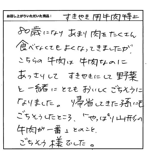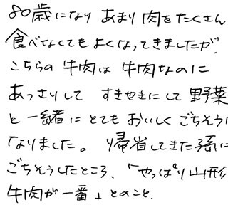 80歳になりあまり肉をたくさん食べなくてもよくなってきましたが、こちらの牛肉は牛肉なのにあっさりしてすきやきにして野菜といっしょにとてもおいしくごちそうになりました。帰省してきた孫にもごちそうしたところ、「やっぱり山形の牛肉が一番」とのこと。 ごちそう様でした。
