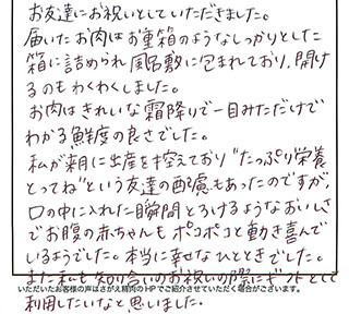 お友達にお祝いとしていただきました。届いたお肉はおじゅうお重箱のようなしっかりとした箱に詰められ風呂敷に包まれており、開けるのもわくわくしました。お肉はきれいな霜降りで一目みただけでわかる鮮度の良さでした。私が来月に出産を控えており"たっぷり栄養とってね"という友達の配慮もあったのですが、口の中に入れた瞬間とろけるようなおいしさでお腹の赤ちゃんもポコポコと動き喜んでいるようでした。本当に幸せなひとときでした。また私も知り合いのお祝いの際にギフトとして利用したいなと思いました。