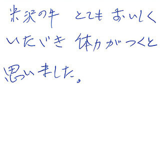 米沢の牛とてもおいしくいただき体力がつくと思いました。