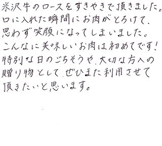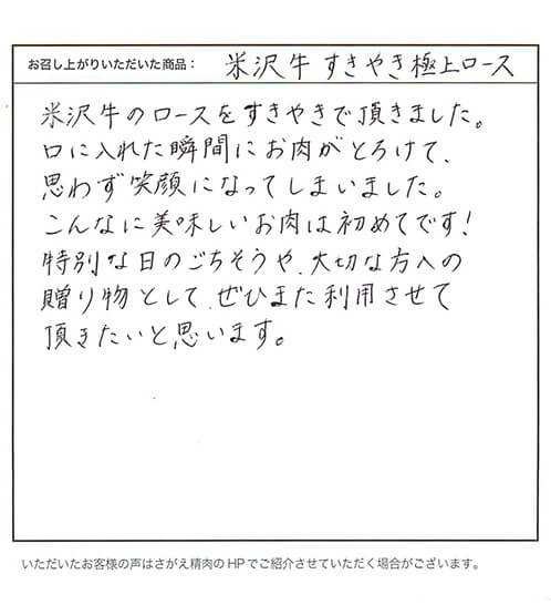 米沢牛のロースをすきやきで頂きました。口に入れた瞬間にお肉がとろけて、思わず笑顔になってしまいました。こんなに美味しいお肉は初めてです!特別な日のごちそうや、大切な方への贈り物として、ぜひまた利用させて頂きたいと思います。