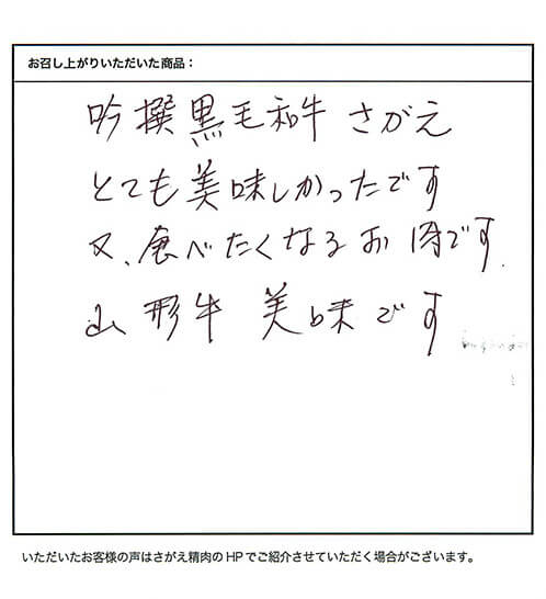お客さまの声や口コミ・レビューをご紹介いたします。お寄せいただいた温かいお言葉を励みに、もっと、もっと、ご満足いただけるお肉をご提供できるよう努めてまいります。