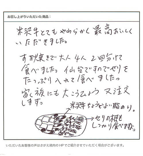 米沢牛とてもやわらかく最高おいしくいただきました。すき焼きで大人4人2回分けて食べました。仙台ですのでせりをたっぷり入れて食べました。家族にも大こうひょう又注文します。