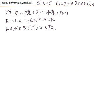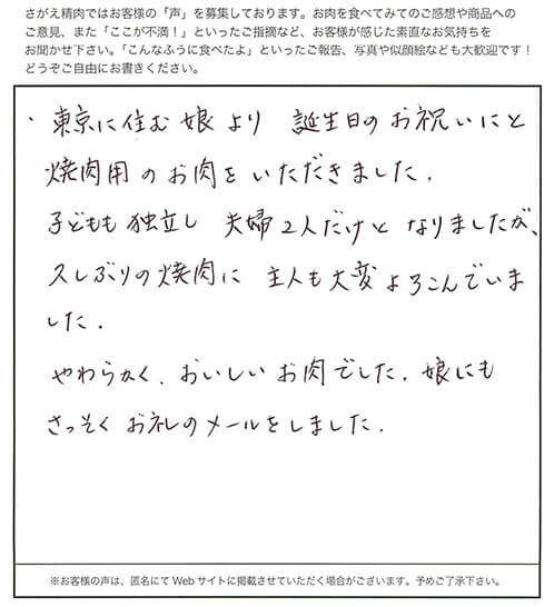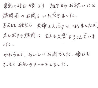 東京に住む娘より誕生日のお祝いにと焼肉用のお肉をいただきました。子どもも独立し夫婦2人だけとなりましたが、久しぶりの焼肉に主人も大変よろこんでいました。やわらかく、おいしいお肉でした。娘にもさっそくお礼のメールをしました。