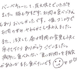 バーベキューにて、炭火焼きでいただきました。脂も多すぎず、お肉の食べごたえもありおいしかったです。塩、コショウでお肉の甘み、やわらかさも味わえました。また、注文して、届け時間の変更も快く受けて下さりありがとうございました。滅多に食べれない"良いお肉"を機会があればまた食べたいです(・v・)♡♡♡