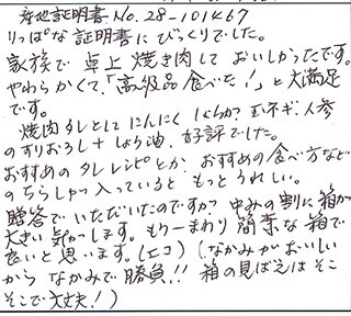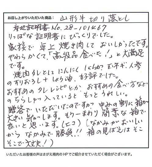 りっぱな証明書にびっくりでした。家族で卓上焼き肉しておいしかったです。やわらかくて、「高級品食べた!」と大満足です。焼肉タレとしてにんにくしょうが玉ねぎ、人参のすりおろし+しょう油、好評でした。おすすめのタレレシピとか、おすすめの食べ方などのちらしが入っているともっとうれしい。贈答でいただいたのですが、中みの割に箱が大きい気がします。もう一まわり簡素な箱で良いと思います。(エコ)(なかみがおいしいからなかみで勝負!!箱の見ばえはそこそこで大丈夫!)