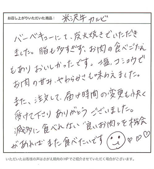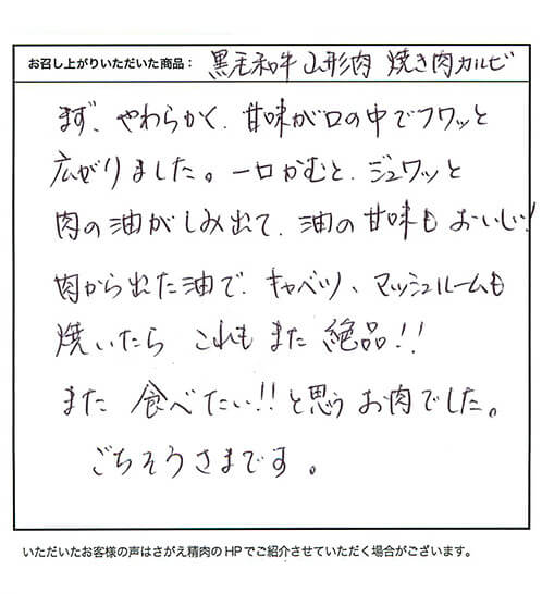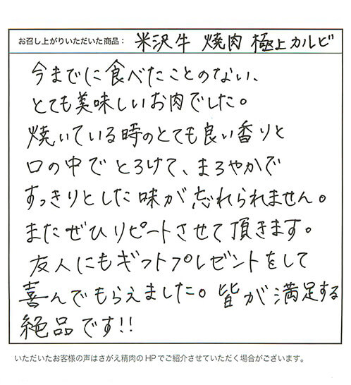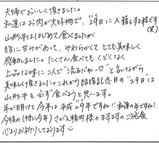 夫婦でおいしく頂きました。私達はお肉が大好物で、29(にく)日に入籍をする程です(笑)山形牛ははじめて食べましたが脂に甘みがあって、やわらかくてとても美味しく感動しました。たくさん食べてもくどくなく上品な味に二人で"流石だねー♡"と言いながら美味しく頂きました。これから結婚記念日の"29日"は山形牛を必ず食べようと思います。年が明けて今年は平成29(にく)年ですね!!私達の年ですね!今後の(特に今年)さがえ精肉様のますますのご発展心よりお祈りしております^v^