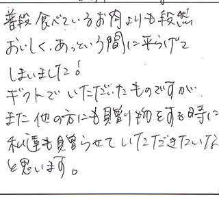 普段食べているお肉よりも段然おいしく、あっという間に平らげてしまいました!ギフトでいただいたものですが、また他の方にも贈り物をする時に私達も贈らせていただきたいなと思います。