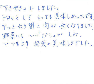 「すきやき」にしました。トロッとしてとっても美味しかったです。アッと云う間に肉が無くなりました。野菜にもいい「だし」がしみ、いつもより格段の美味しさでした。