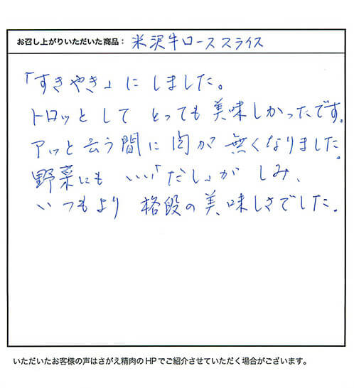 先日、米沢牛肩ロースを頂きました。うまれて初めてこんな柔らかい美味しいお肉を食べました。大げさかと思われるかも知れませんが本当の気持ちです♡バレンタインデーに主人と2人で乾杯しながらとても美味しくすきやきにして頂きました。感謝です。けんか中でしたがお肉のおかげで仲良くなりました。ほんとにありがとうございました♡♡♡