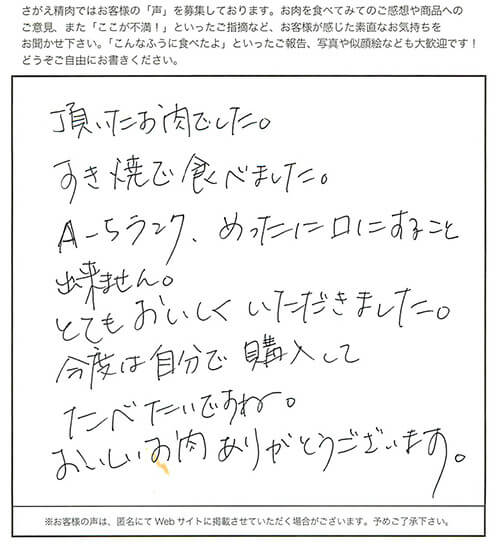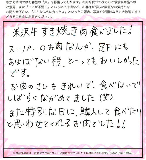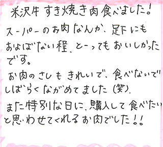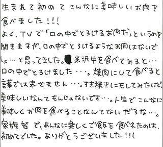 生まれて初めてこんなに美味しいお肉を食べました!!!よく、TVで「口の中でとろけるお肉だ」というのを聞きますが、口の中でとろけるようなお肉はないでしょ…と思ってました。米沢牛を食べてみると…口の中でとろけました…。焼肉にして食べると言葉では表せません…。すき焼きにもしてみたけど、美味しいなんてもんじゃないです…。人生でこんなに美味しくお肉を食べることなんてないだろな…。家族皆で、あんなに楽しくご飯を食べれたのは、初めてでした。ありがとうございました!!!