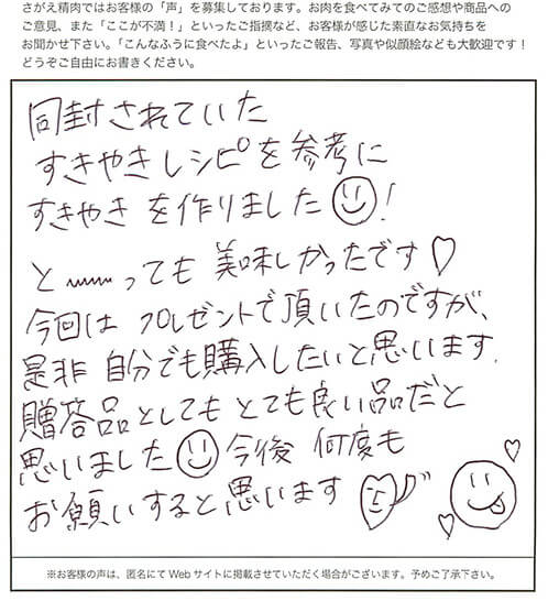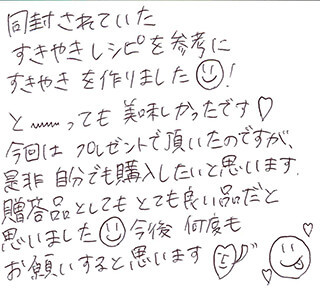同封されていたすきやきレシピを参考にすきやきを作りました(・v・)!と〜〜〜っても美味しかったです♡今回はプレゼントで頂いたのですが、是非自分でも購入したいと思います。贈答品としてもとても良い品だと思いました(・v・)今後何度もお願いすると思います