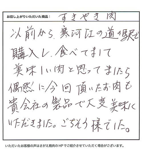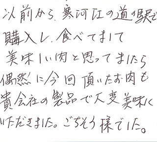以前から、寒河江の道の駅で購入し、食べてまして美味しい肉と思ってましたら偶然に今回頂いたお肉も貴会社の製品で大変美味しくいただきました。ごちそう様でした。