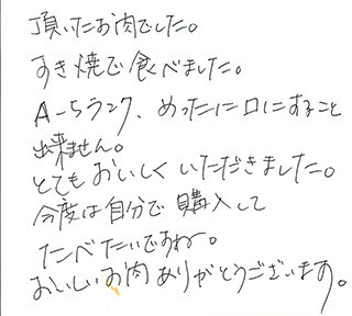 頂いたお肉でした。すき焼で食べました。A-5ランク、めったに口にすること出来ません。とてもおいしくいただきました。今度は自分で購入してたべたいですね。おいしいお肉ありがとうございます。