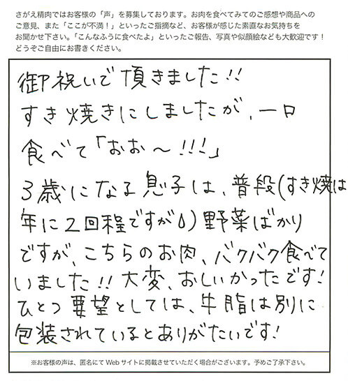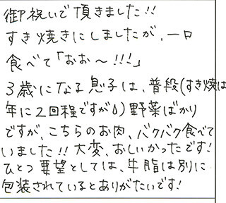 御祝いで頂きました!!すき焼きにしましたが、一口食べて「おお〜!!!」3歳になる息子は普段(すき焼は年に2回程ですが;)野菜ばかりですが、こちらのお肉、バクバク食べていました!!大変、おいしかったです!ひとつ要望としては、牛脂は別に包装されているとありがたいです!