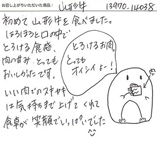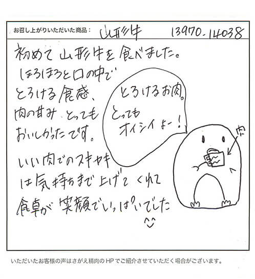 初めて山形牛を食べました。ほろほろと口の中でとろける食感、肉の甘み、とってもおいしかったです。いい肉でのスキヤキは気持ちまで上げてくれて食卓が笑顔でいっぱいでした^v^