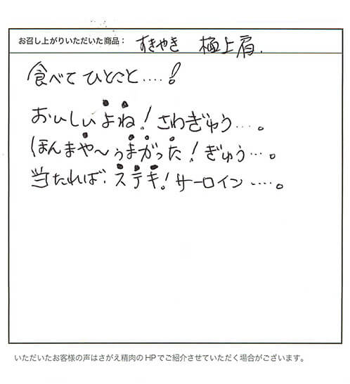 今回で2回目の母の日に送られて来ました。とても感動しました。肉の甘みとジューシーさが何とも云えないおいしさです。レシピが入っておりましたのですき焼で食べました。