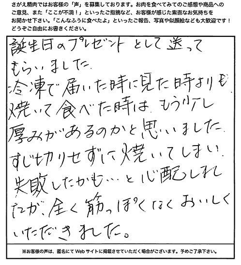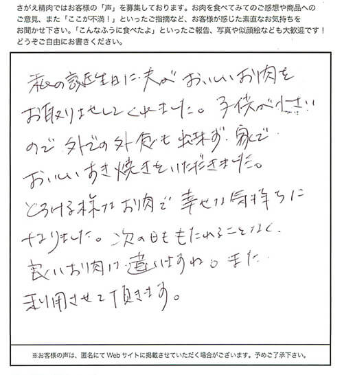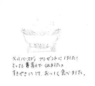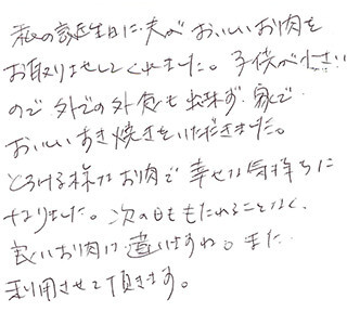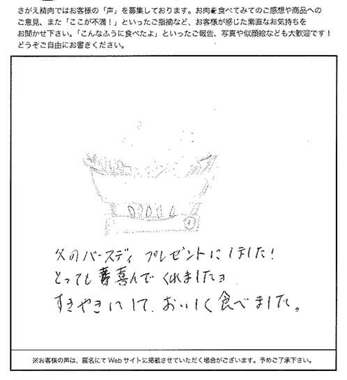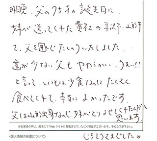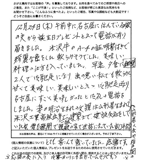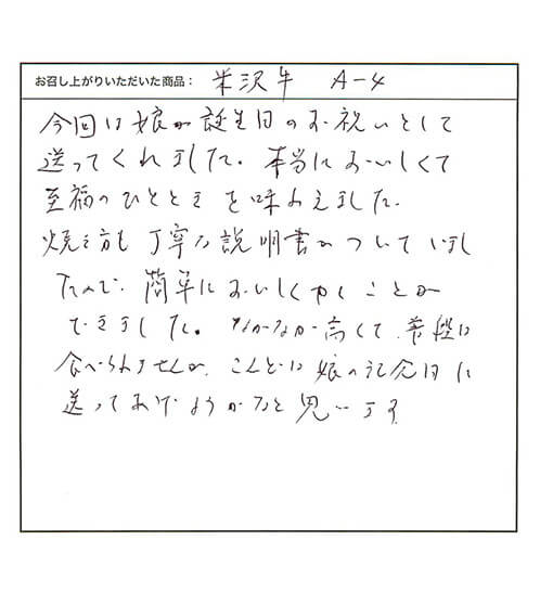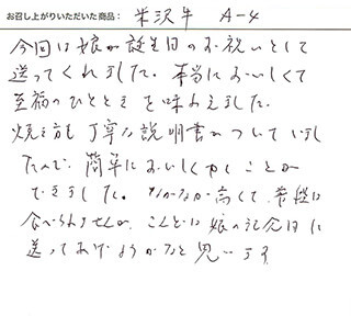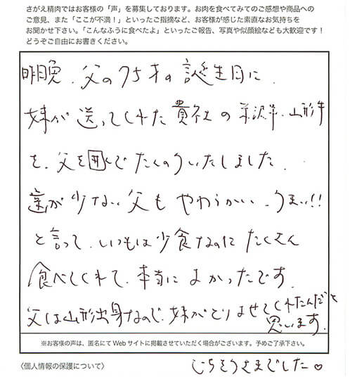 昨晩、父の75才の誕生日に、妹が送ってくれた貴社の米沢牛・山形牛を、父を囲んでたんのういたしました。歯が少ない父もやわらかい、うまい!!と言って、いつもは少食なのにたくさん食べてくれて、本当によかったです。父は山形出身なので、妹がとりよせてくれたんだと思います。ごちそうさまでした!