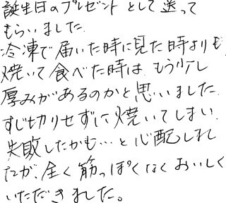 誕生日のプレゼントとして送ってもらいました。冷凍で届いた時に見た時よりも焼いて食べた時は、もう少し厚みがあるのかと思いました。すじ切りせずに焼いてしまい、失敗したかも…と心配しましたが、全く筋っぽくなくおいしくいただきました。