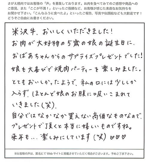 5歳の娘の誕生日に、おばあちゃんからのサプライズプレゼント【米沢牛/やきにく/誕生日プレゼント】