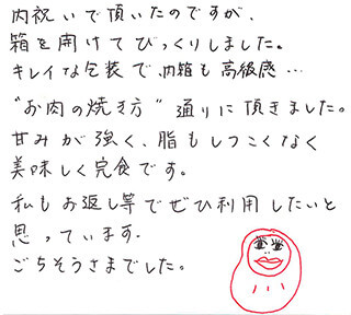 内祝いで頂いたのですが、箱を開けてびっくりしました。キレイな包装で、内箱も高級感…“お肉の焼き方”通りに頂きました。甘みが強く、脂もしつこくなく美味しく完食です。私もお返し等でぜひ利用したいと思っています。ごちそうさまでした。
