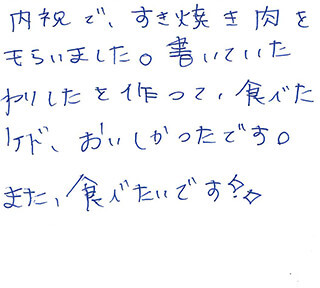 前略。新築祝いの内祝いで、山形牛を頂きました。自分では、なかなか買うことができず、高級和牛を口にした時には、とても美味しく感動しました。近くの肉屋さんでたまに牛肉を買うんですが、全く肉の質が違うのに驚きました。ご馳走様でした!!東京ディズニーチケットをお願いします。以前行ったことありますがこの年になって、また行ってみたいので最後かもしれないので!!よろしく