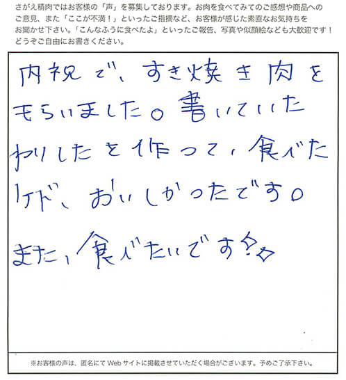 ようやく誕生した息子夫婦の長女の内祝いとして届きました。隣県に住んでいながらなかなか敷居高く、憧れているうちに後期高齢者夫婦..。思いがけず口にすることが出来ました。..開封するなりしっかりと証明書まで添付され、嬉しさと感動でいっぱいになりました。裏切ることのない素晴らしいお肉でした。2人では勿体無く量も多く2回に分けすき焼きで最高の美味しさでした。