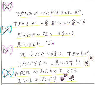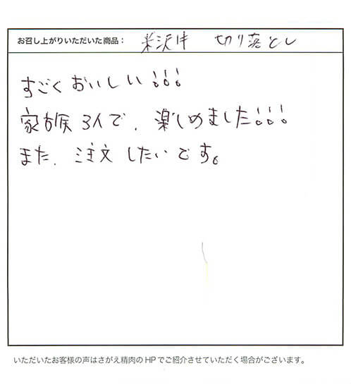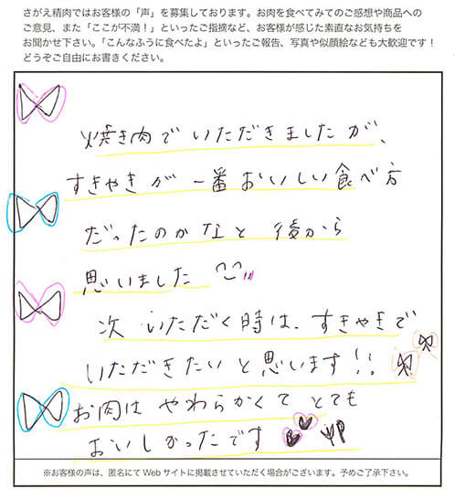 お客さまの声や口コミ・レビューをご紹介いたします。お寄せいただいた温かいお言葉を励みに、もっと、もっと、ご満足いただけるお肉をご提供できるよう努めてまいります。